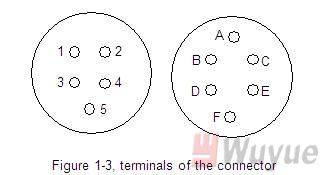 The terminals of connector are as follows: (numeric symbol for five pin cable, alphabetic symbol for six pin cable)