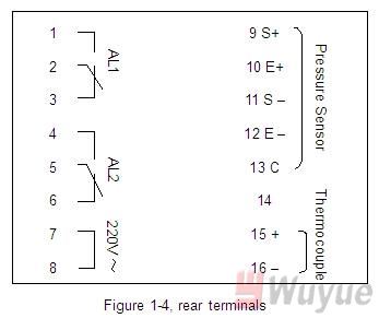 After power-on, PW206 does self-check. At the same time, the above display unit shows the full scale of pressure, and the lower display unit shows the full scale of temperature. After about 2 seconds, the above display unit shows the divided value for pressure, and the lower display unit shows the thermocouple type and divided value for temperature. Finally, PW206 return to working status automatically.